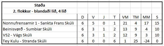 Nonnufrensarnir 1 (Sankta Frans Skúli) vunnu bólkin. Beinisvørð (Sumbiar Skúli) hevði sama stigatal sum VS2 frá Vágs Skúla, men betri málmun og gjørdist tí nr. 2.