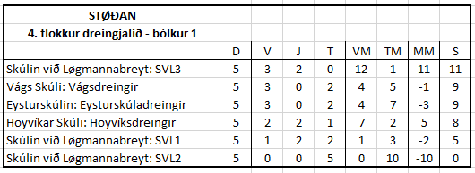 Úrslitið av dreingjabólkinum í 4. flokki varð sum víst í myndini. Og merkir hetta, at hesi fýra liðini eru komin víðari til finaluumfarið sum verður um mánaðarskiftið apríl/mai.