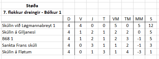 Í bólkaspælinum hjá dreingjunum í 7. flokki hava Skúlin við Løgmannabreyt, Skúlin á Giljanesi, B68 2 og Tvøroyrar Skúli spælt seg víðari til finaluumfarið. Liðini skulu spæla í hálvfinalu-umfarinum, sum verður stóra finaludagin 2. mai. 2019.