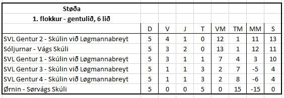 SVL Gentur 2 (Skúlin á Løgmannabreyt) vunnu umfarið við 13 stigum, meðan Sóljunar (Vágs Skúli) fingu 11 stig á 2. plássi.