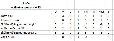 Tofta Skúla og Tvøroyrar Skúli vunnu gentu-umfarið hjá 8. flokki. Liðini bæði fingu sama stigatal, sama málmun og við sama tal av málum fyri og ímóti. So tað hendaði heilt javnt.